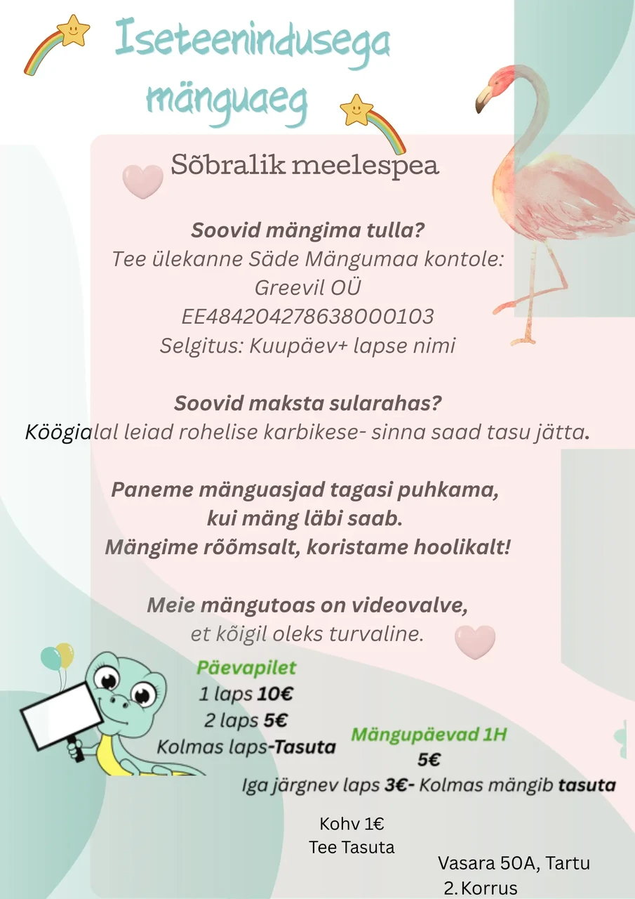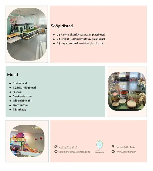 Meie mängumaa pindala on 143 m², mis on jaotatud kaheks osaks: üks aktiivsemate tegevuste ja teine rahulikumate tegevuste ning söögiala jaoks. Kui vajate rohkem istekohti, on võimalus neid ette teatamisega juurde tellida. Anna meile oma soovidest teada, et saaksime muuta teie ürituse sujuvaks ja mugavaks.