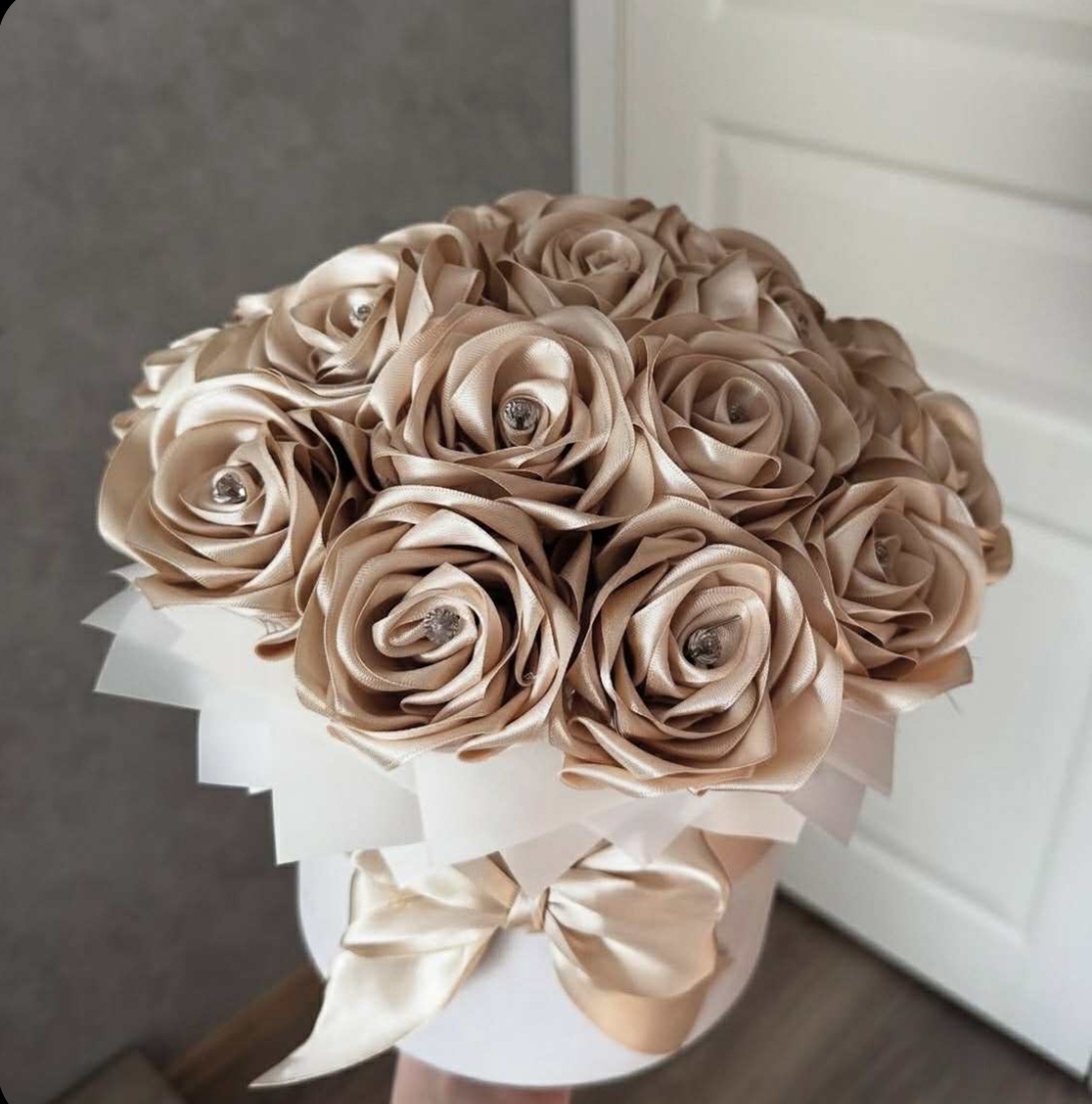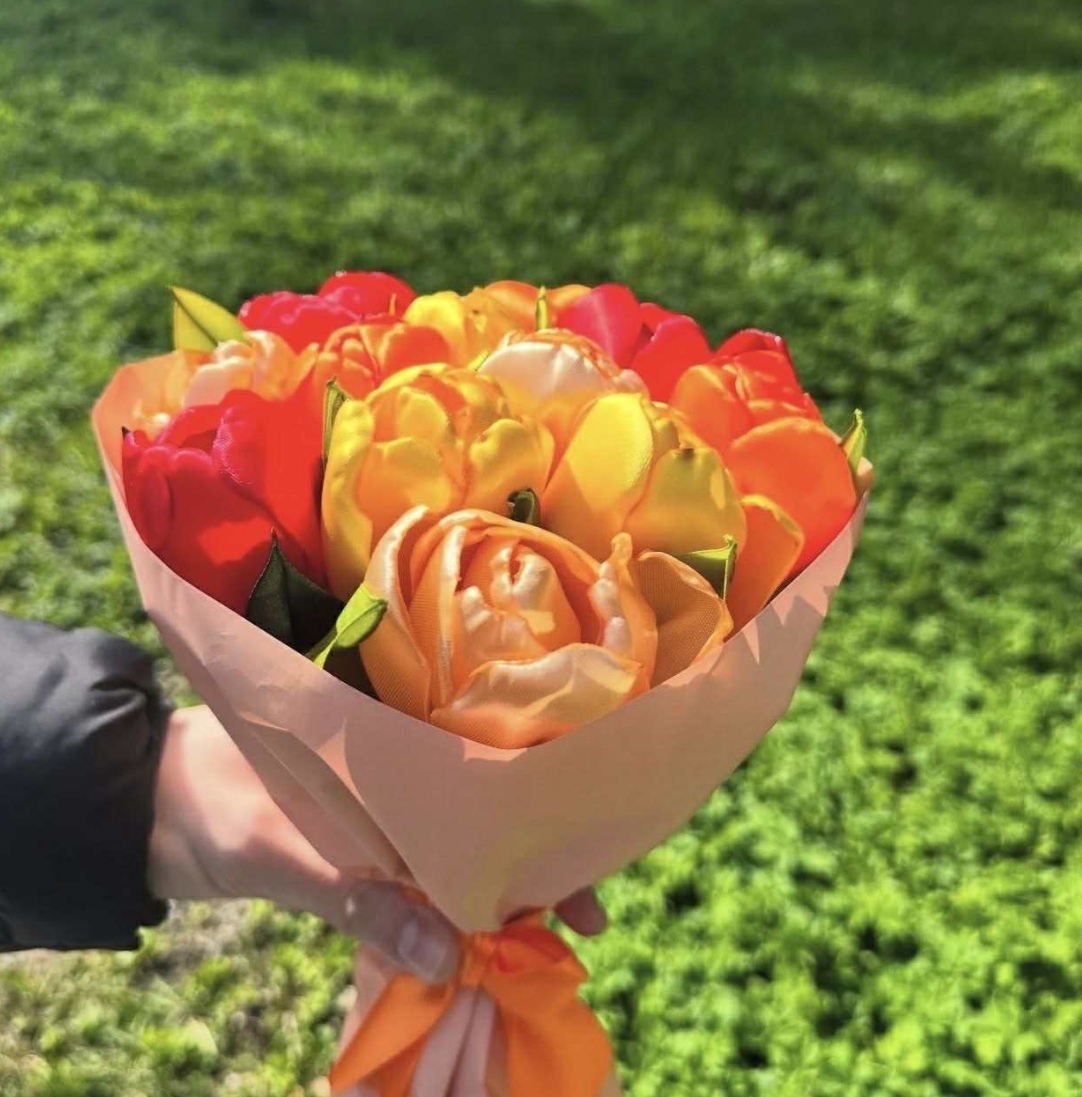 Есть возможность заказать у нас красивые цветочные композиции из атласных лент.